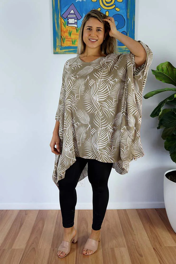 Embrace Summer with our tropical Palm Cove taupe kaftan top.